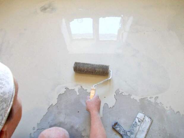Едем дальше и переходим непосредственно к процессу выравнивания пола. Вооружаемся широким шпателем шириной не менее 35см, пластиковым валиком с шипами и выливаем приготовленную смесь из ведра прямо на пол. С этого момента все работы лучше производить в ускоренном темпе. Обзаведитесь помощником, который будет замешивать и готовить вам раствор. Дело в том, что каждый последующий замес лучше соединять с предыдущим, пока первый не потерял своей текучести.