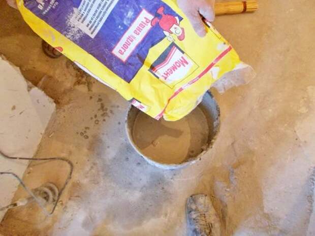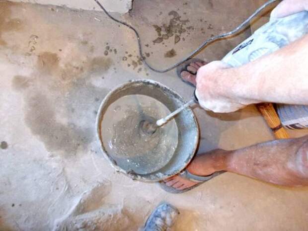 Вот только теперь, пока грунтованная поверхность просыхает, можно заняться приготовлением первой порции нивелирующего раствора.