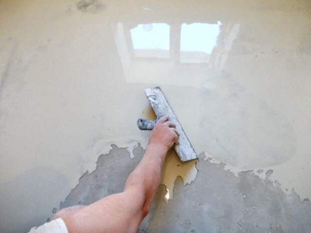 Теперь нам пригодится шпатель – с его помощью нужно помогать медленно растекающейся смеси равномерно распределяться по поверхности пола. Не нужно тщательно выглаживать получаемую поверхность и добиваться идеальности – поверьте, необходимая гладкость получится сама собой. Ваша задача – просто равномерно распределить смесь.